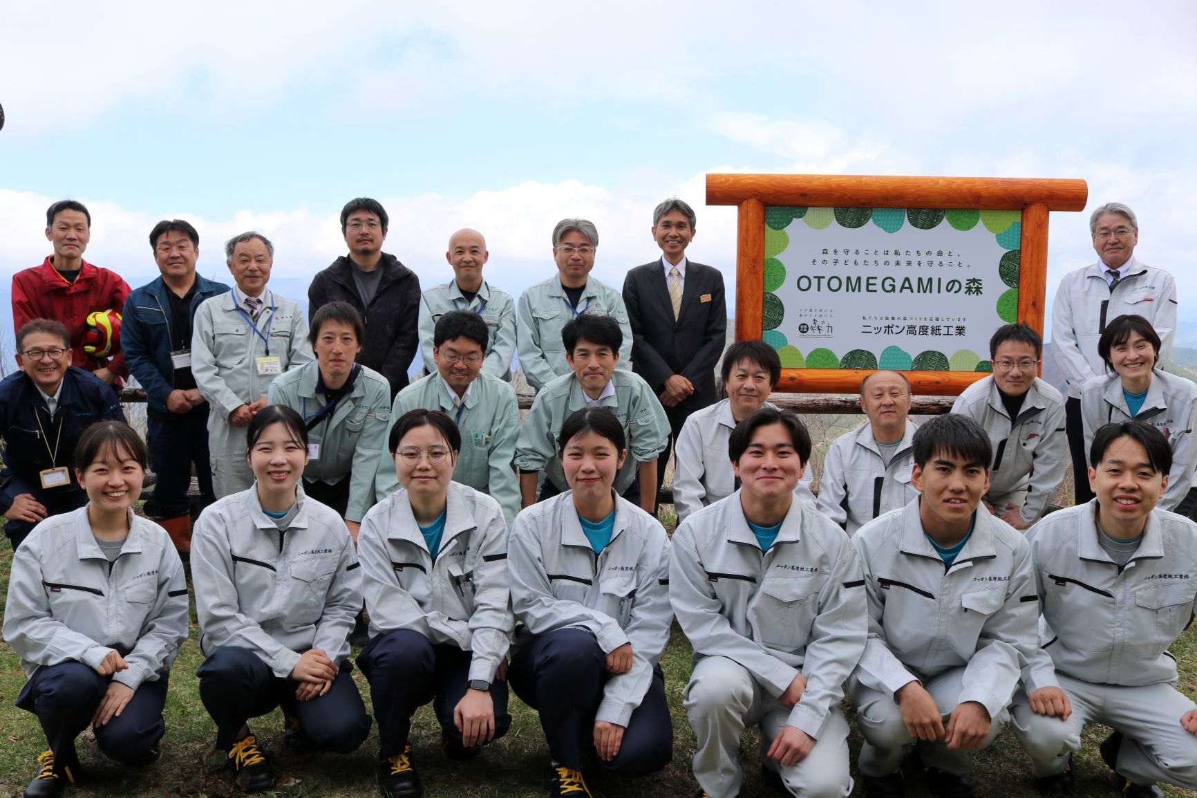 2026年2月18日に高知県、仁淀川町と「協働の森づくり事業」パートナーズ協定(対象エリアの愛称”OTOMEGAMIの森”)の締結に伴い、同年4月7日に当社PR看板除幕式および新入社員よる森林保全活動を開催しました。除幕式は、高知県からは林業振興・環境部林業環境政策課、仁淀川町からは片岡町長と農林課の方々にご出席を頂き、総勢15名程度で開催されました。除幕は福田課長補佐(高知県林業振興・環境部林業環境政策課)、片岡町長(仁淀川町)、近森社長により執り行われました。また、同日に新入社員よる森林保全活動を実施しました。ノコギリによる間伐やチェーンソーによる丸太切りの体験などを指導員の指示に従って行いました。