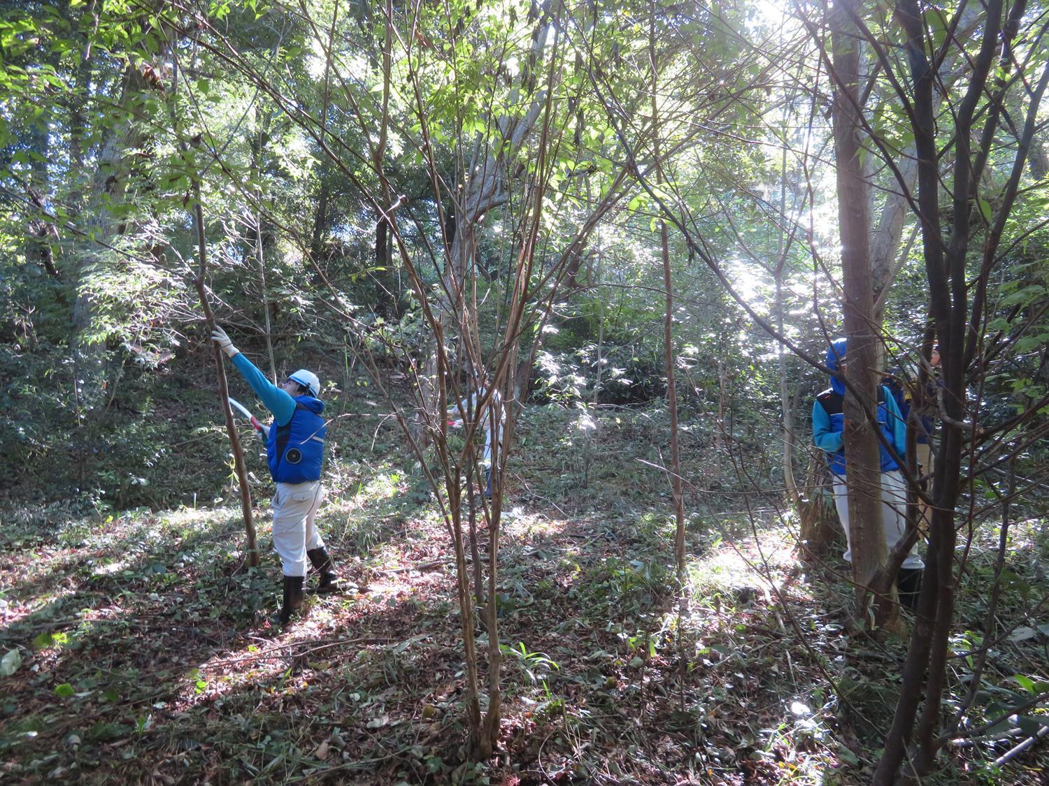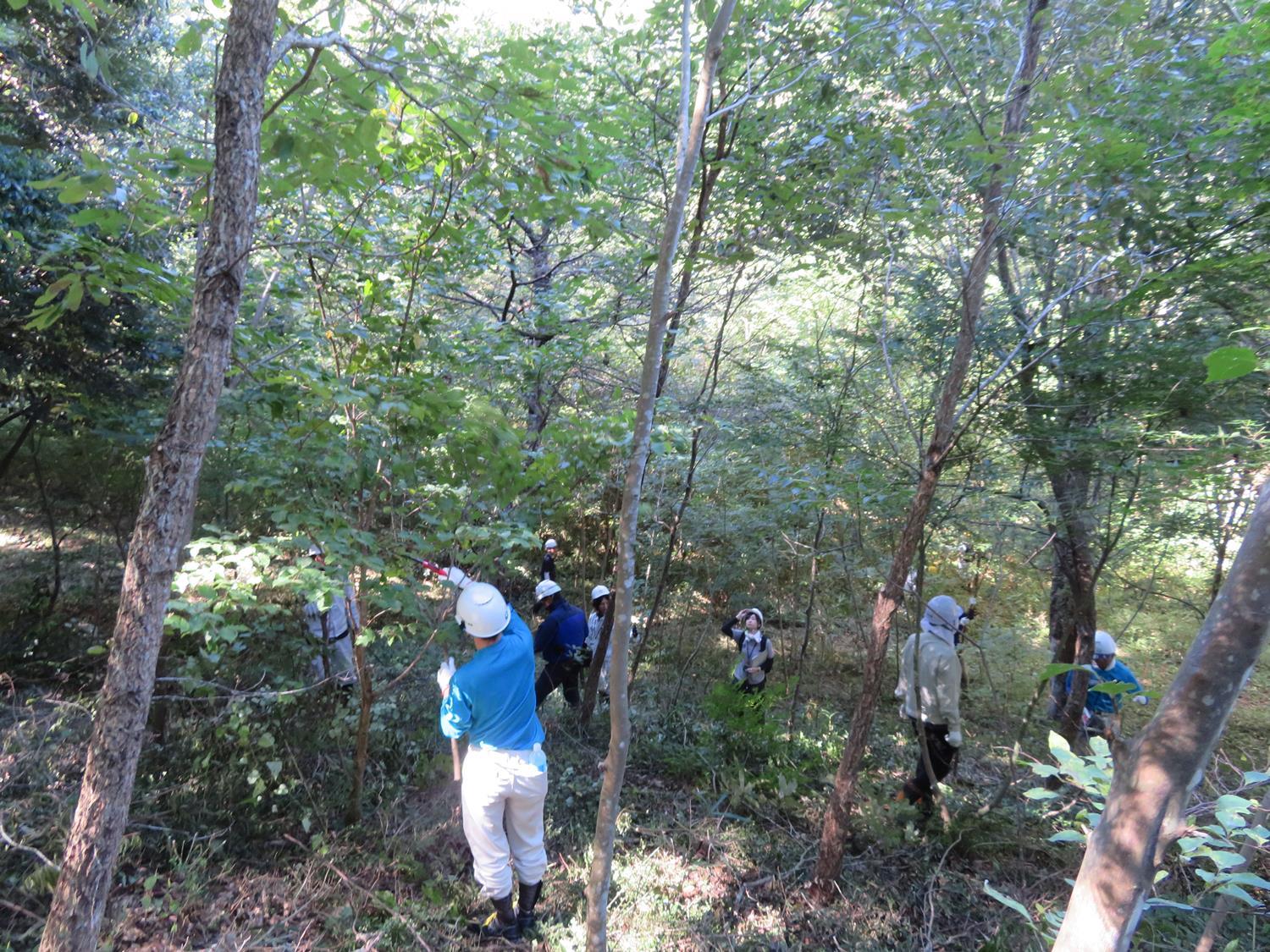 当社従業員12名と鳥取県持続可能な地下水利用協議会会員(※)の皆さまを含めて約30名が鳥取県西部森林組合さん指導のもと、広葉樹エリア約1800㎡の枝打ちやつる切りの作業を行いました。