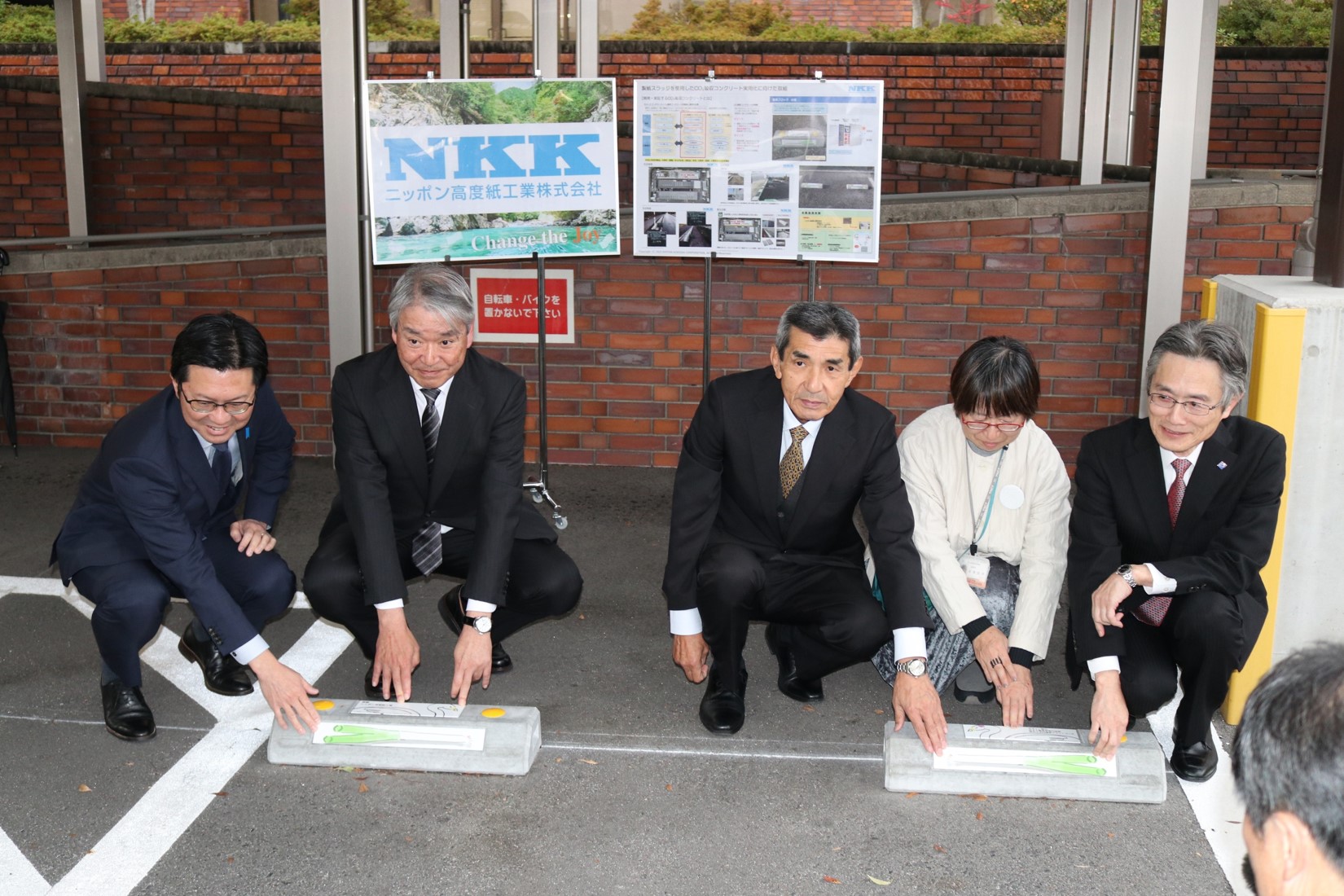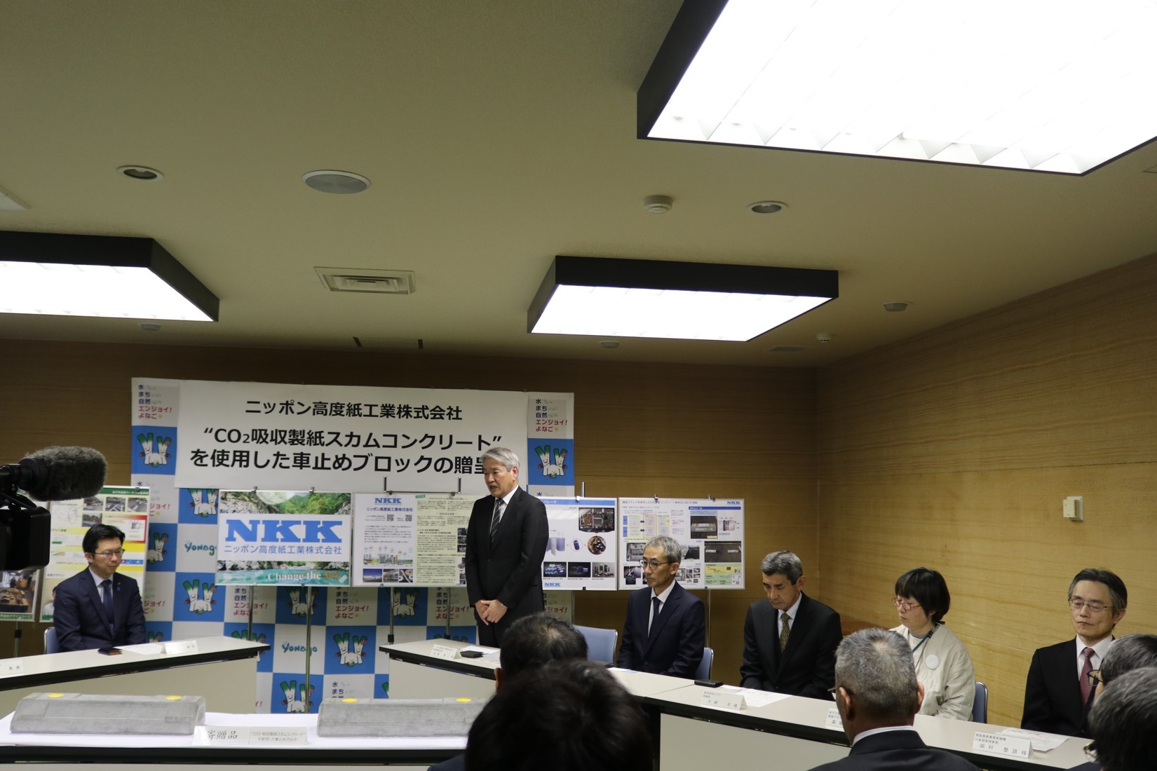 この度、スラッジを材料の一部として有効活用したコンクリートの開発に成功し、車止めブロックとして実用化したもの15セットを米子市に寄贈いたしました。